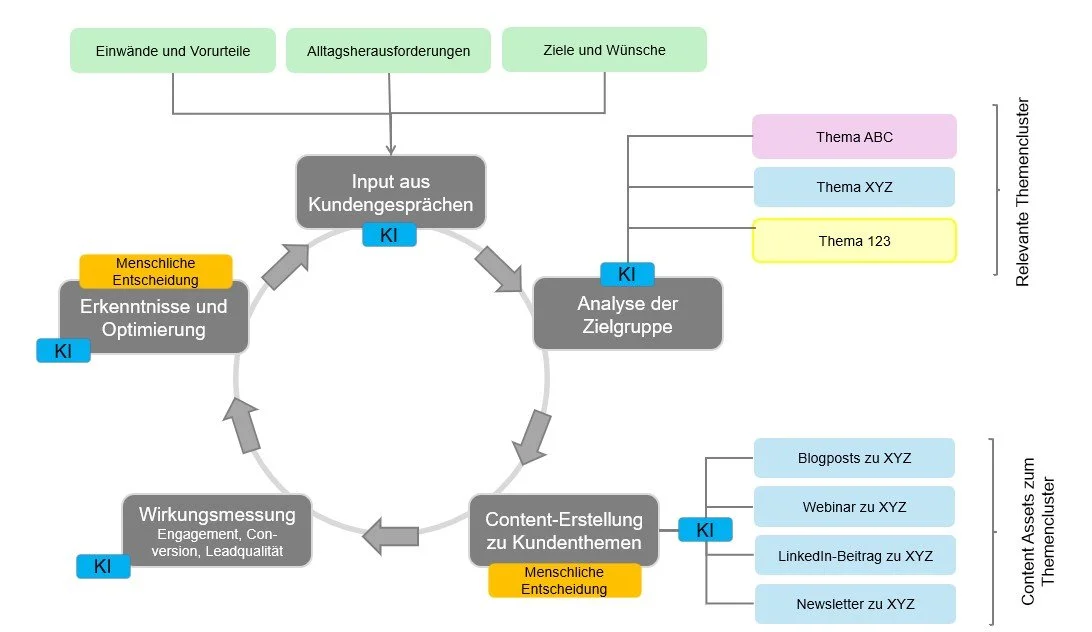 Die Ergebnisse einer solchen Vorgehensweise sind strategische Content-Assets, die du mehrfach verwenden kannst. Ein reales Kundenthema (XYZ) wird damit zu einem Blogartikel, einem LinkedIn-Post und zum zentralen Teil eines Newsletters. Du adressierst es in einem Webinar oder es wird in die Sales-Unterlagen deiner Aussendienst-Mitarbeitenden aufgenommen und taucht in den FAQ deiner Webseite auf.